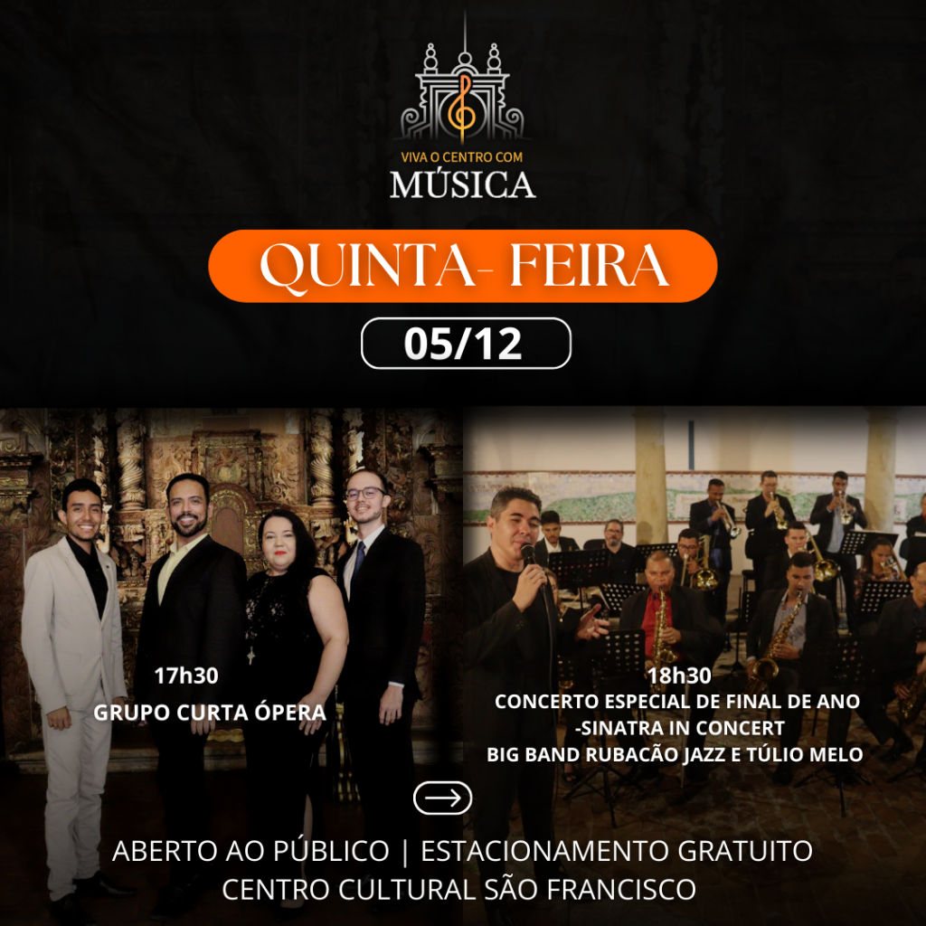 A programação do evento inclui o recital operístico do grupo Curta Ópera, com músicas de Natal, acompanhado por um quinteto de cordas. Em seguida, a Big Band Rubacão Jazz fará uma apresentação com o cantor Túlio Melo, em homenagem a Frank Sinatra. A entrada para o concerto é gratuita, assim como o acesso ao estacionamento do Centro Cultural São Francisco, que fica localizado atrás da Igreja de São Francisco.