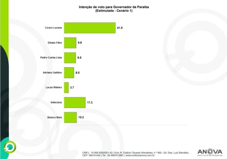 Nesse cenário, o prefeito da Capital obteve 25,5% das intenções de voto, seguido de Adriano Galdino (7,1%), João Azevêdo (5,8%), Efraim Filho (5,2%), Pedro Cunha Lima (3,7%), Lucas Ribeiro (2,2%), Ricardo Coutinho (0,2%) e Marcelo Queiroga (0,1%). Os indecisos e que tem intenção de anular ou votar em branco somam 50,2%.