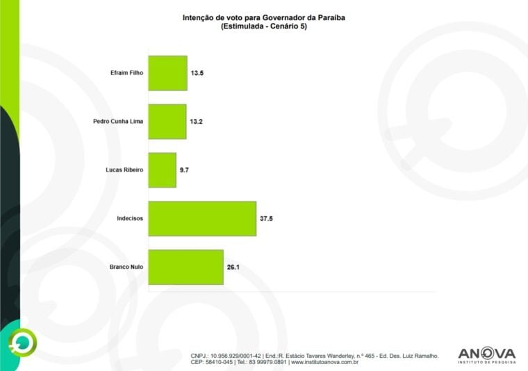 No cenário 5, Efraim Filho lidera com 13,5%, Pedro Cunha Lima (13,2%) e Lucas Ribeiro (9,7%). Indecisos, brancos e nulos somam 63,6%.